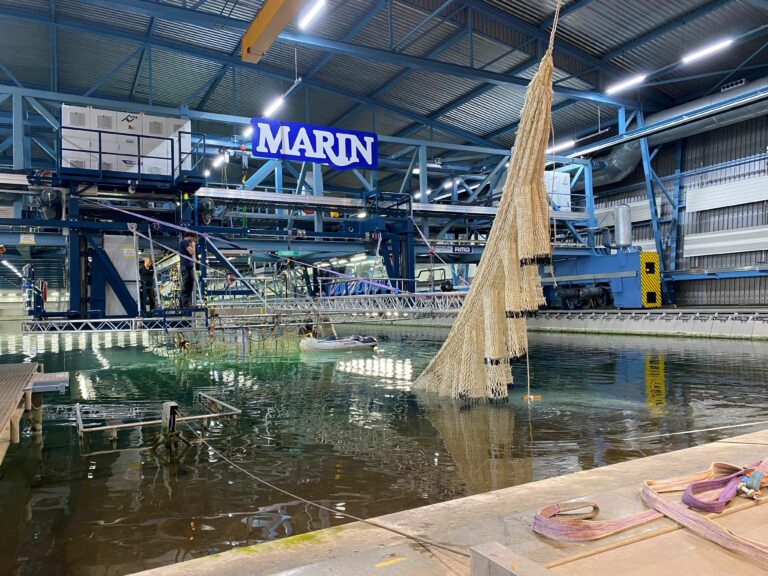 MARIN heeft sleepproeven uitgevoerd met visnetten op ware grootte. Samen met het Visserij-innovatiecentrum, TU Delft en Wageningen Marine Research heeft MARIN met deze proeven het inzicht in de trekkrachten en waterdoorstroom van visnetten vergroot. Het combineren van hydrodynamische kennis en praktische visserijkennis moet leiden tot verdere verduurzaming van de visserijsector en selectievere visserijmethoden.